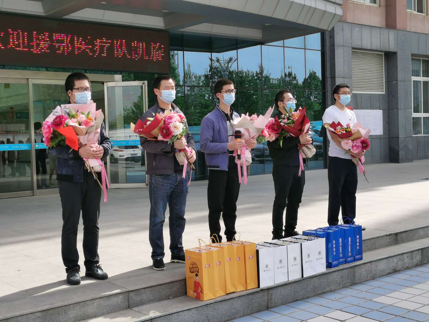 院领导班子全体成员、副县级领导干部带领医院行政科室全体人员和部分医护人员在门诊楼前隆重举行欢迎仪式,将鲜花、慰问品以及掌声送给我们的“最美逆行者”。欢迎仪式由院长孙建勋主持。