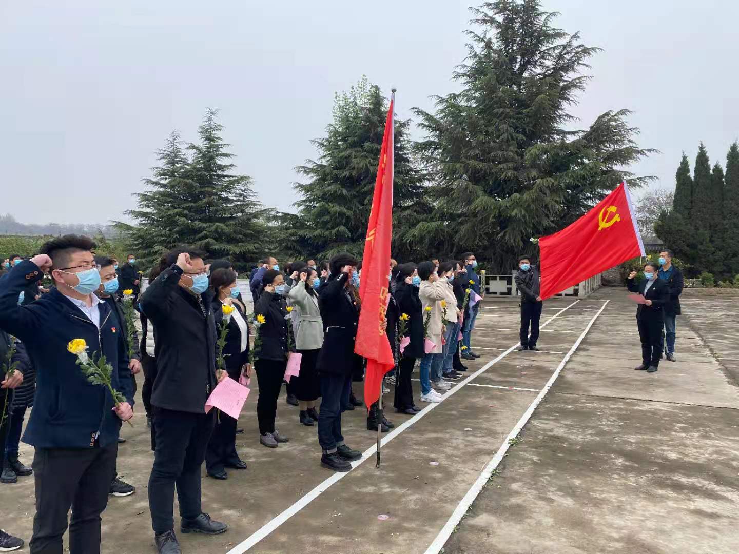 朝阳烈士陵园内,松柏苍翠挺拔,气氛庄严肃穆。上午10时,活动开始,现场奏响雄壮高亢的国歌,全体党员齐声高唱。国歌唱毕,大家肃立在革命烈士纪念碑前向烈士默哀。院领导向革命烈士纪念碑敬献花圈,全体人员三鞠躬。
