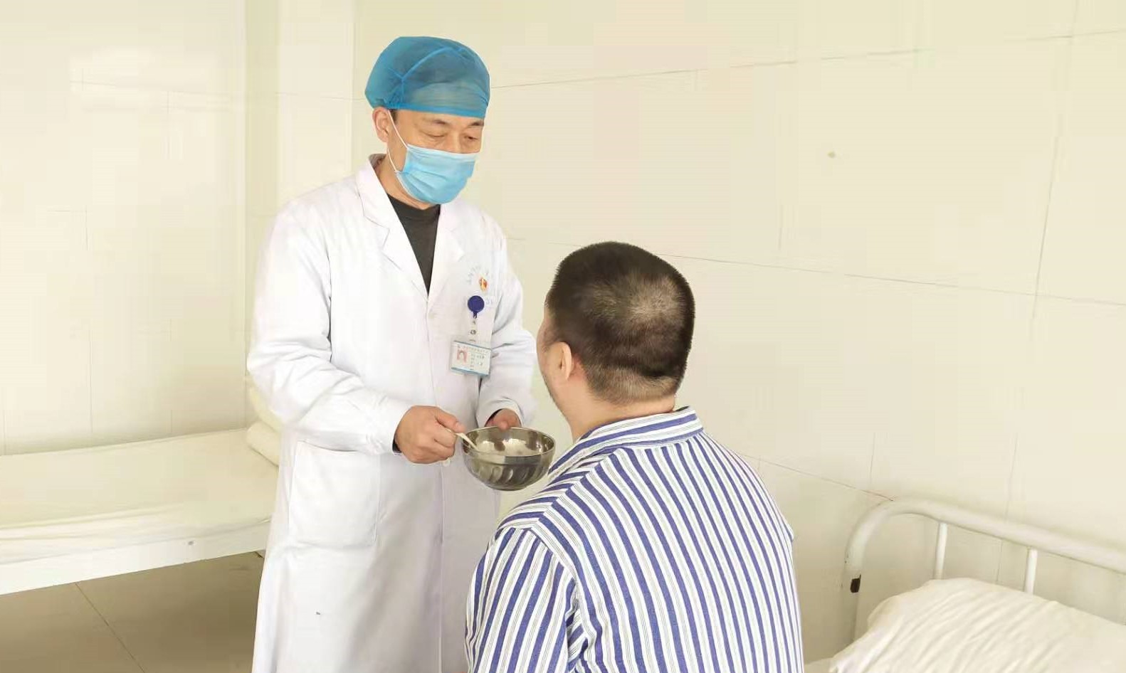 封闭的精神科病房多没有陪护,医护人员就是患者的全部依靠,而新入院的病人病情严重,特别是急性期病人,会有冲动、伤人、毁物、拒食等症状出现。每当有类似病人时,位军伟都冲在前面,,通过自己过硬的沟通技巧给病人进行心理安抚,稳定他们的情绪,想法设法的给病人喂水、喂药、喂饭。他每天严格按规定给病人测量体温、并做好开窗通风、消毒等工作。这些平凡的工作看似简单,而在这疫情严重的特殊时期,他没有退缩,冲在了防控第一线!